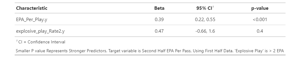 So I have included the same regression framework again, this time using regular-season efficiency and explosive play rates to predict playoff passing efficiency. The results were the exact same.