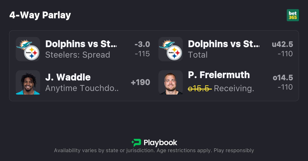 - Dolphins vs Steelers Moneyline: Dolphins +150, Steelers -180