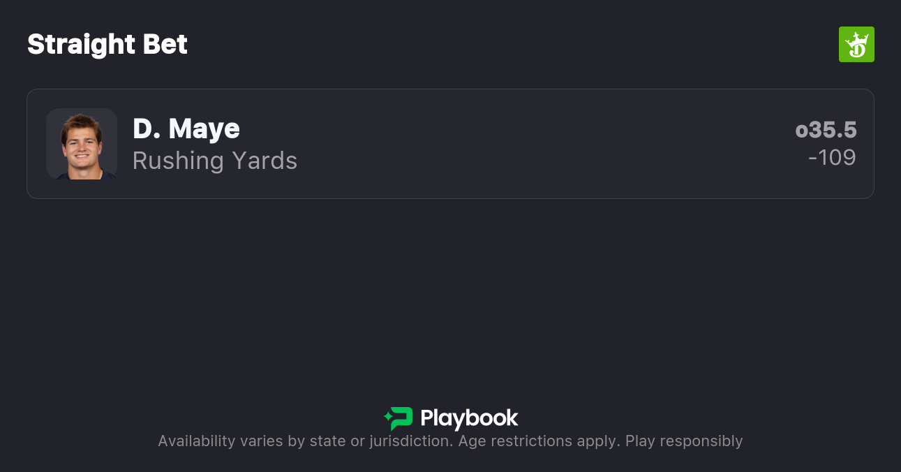 Maye's rushing yards over/under opened around 31.5 yards; that's ticked up around 5-6 yards since, but this is still bettable as long as it's in the 30s.