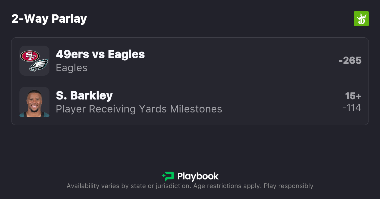 - Eagles vs 49ers Moneyline: Eagles -265, 49ers +215