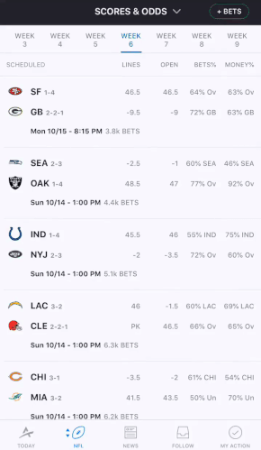 NO PURCHASE OR PAYMENT NECESSARY TO ENTER OR WIN. Open to legal residents of the 50 U.S. and D.C., age 18+ (19+ in AL and NE, 21+ in MS). Void outside the 50 U.S./D.C. and where prohibited. Sweepstakes starts at 7:00:01 PM ET on 10/12/18; ends at 11:59:59 AM ET on 10/16/18. To enter, track at least one bet using The Action Network app. Every eligible account will be entered into a random drawing. Prize: $500. Odds of winning depend on the number of entries received. Limit: 1 entry per person. For full Official Rules, visit here. Sponsor: The Action Network, 12180 Millennium Drive Suite 500, Playa Vista, CA, 90094.