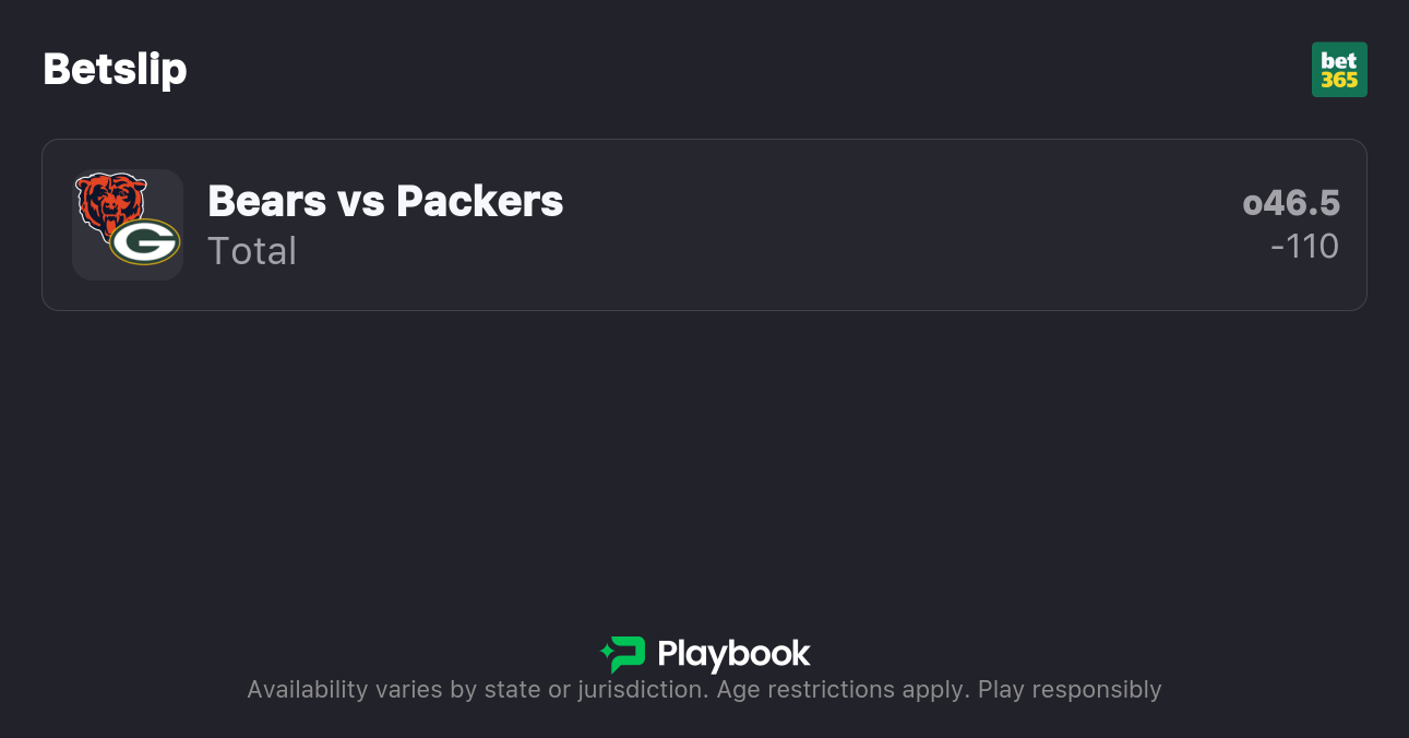 The Bears are 1.5-point favorites over the Packers on the spread (Bears -1.5; -115), with the over/under set at 46.5 total points. Chicago is a -130 favorite to win on the moneyline, while Green Bay is +110 to pull off the upset.