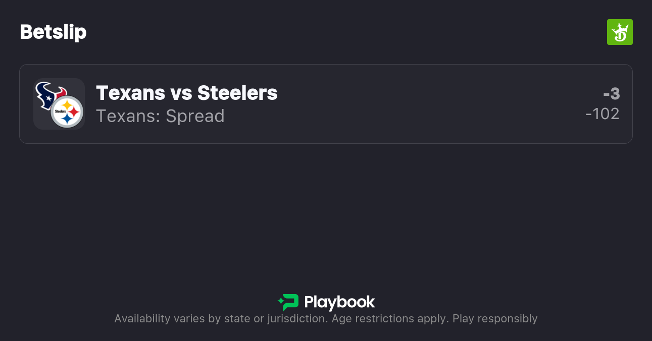 My Texans vs Steelers best bet is on the Texans to cover the spread. Find the best odds by checking our live NFL odds page.