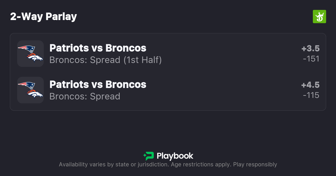 - Patriots vs Broncos pick: Broncos +3.5 1st half spread OR Broncos +4.5