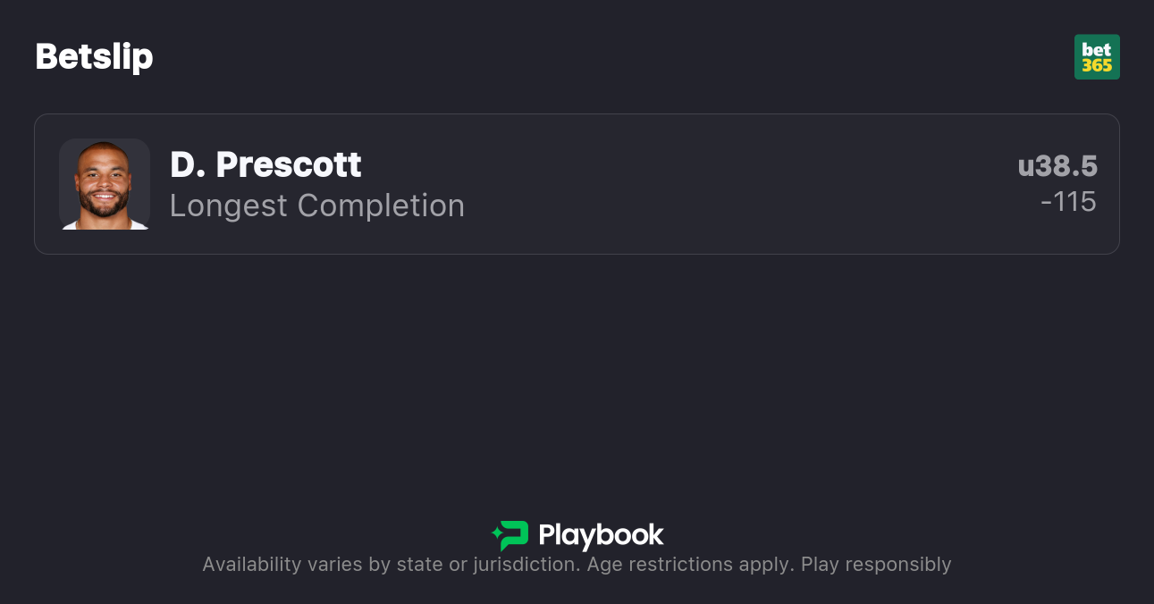 - Dak Prescott Longest Completion Under 38.5 yards (-115; bet365)