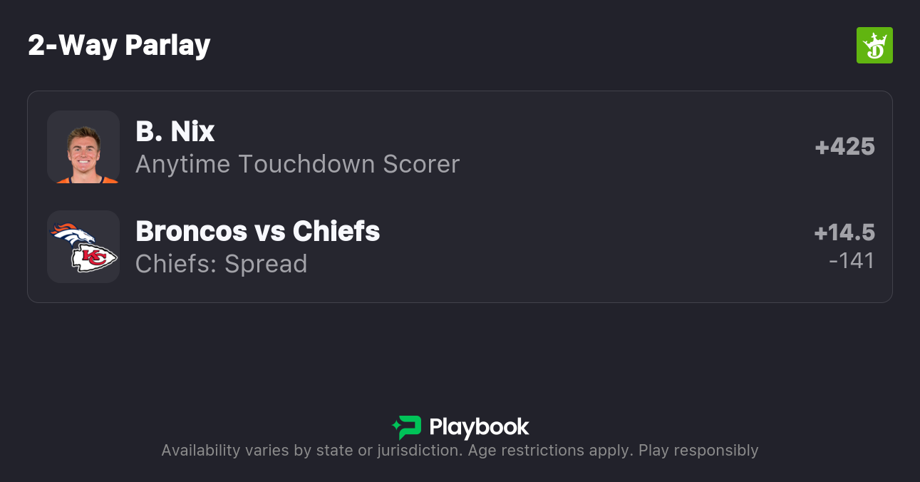 - Bo Nix Anytime Touchdown + Chiefs +14.5 parlay (+1100; DraftKings)