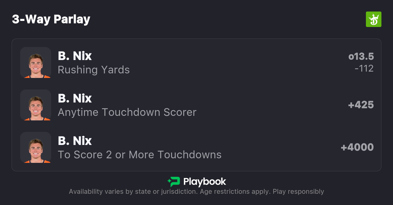 - Bo Nix anytime TD (+425; DraftKings), 2+ TDs (+5000; DraftKings)