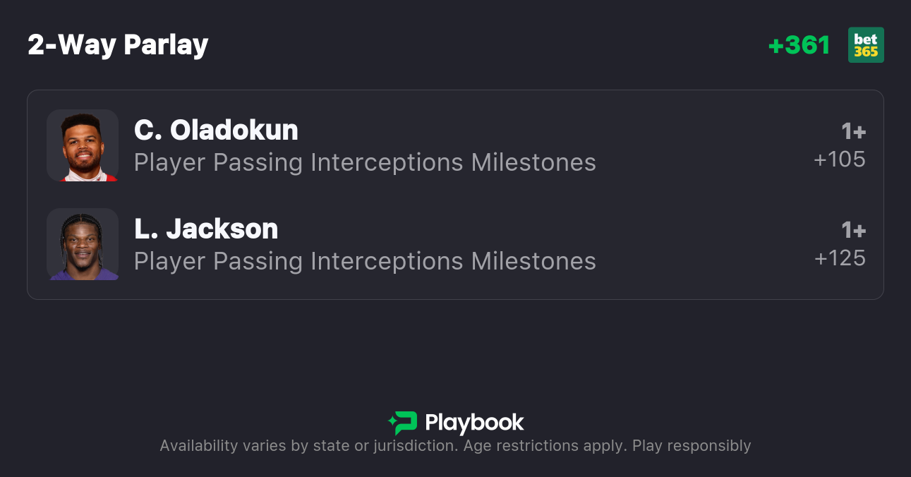 - Lamar Jackson to Throw an Interception (+130; FanDuel)
