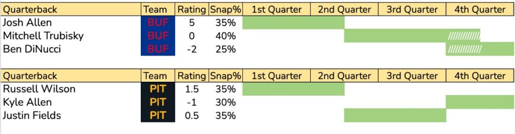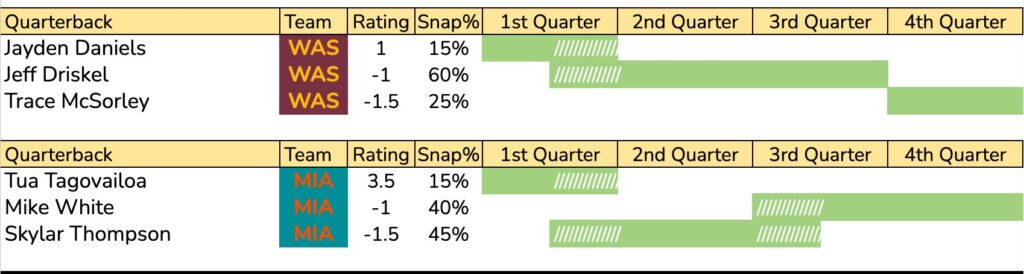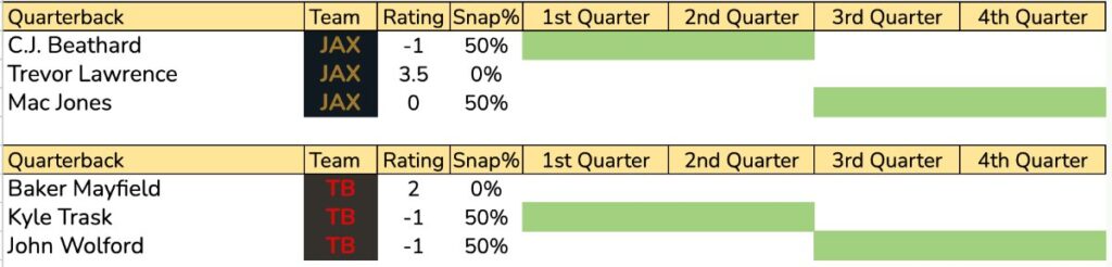 In the first half, we’re likely to see C.J. Beathard vs. Kyle Trask. They're low-end No. 2-caliber QBs who have typically performed well in preseason. The second half should feature John Wolford against Mac Jones. Wolford looked sharp last week, and Jones was extremely good, reaffirming his status as a high-end backup and potentially a below-average starter.