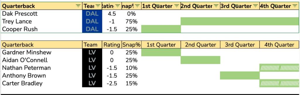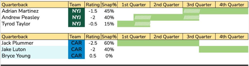 Jack Plummer was predictably a disaster in his NFL debut last week, playing for most of the game. Assuming Carolina rests its starters again tonight, Plummer should start and play at least the first half.