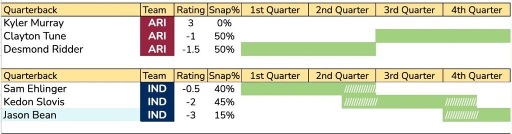 Neither team is expected to play their starters, with the Colts likely starting Sam Ehlinger, who could play most of the first half. Desmond Ridder is expected to start for the Cardinals and also play a significant portion of the first half.