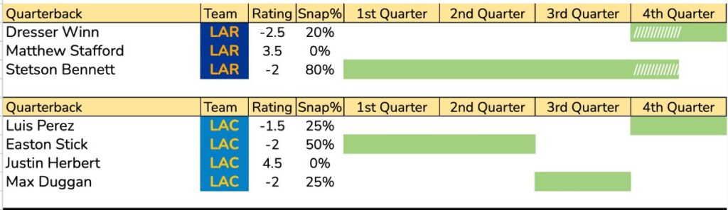 The first half will likely be a battle between Stetson Bennett and Easton Stick, who had a disastrous Week 1. With his job as the Chargers' backup QB on the line, I expect him to bounce back somewhat. However, the Chargers' offensive line was a disaster last week and should struggle against the Rams' second unit.