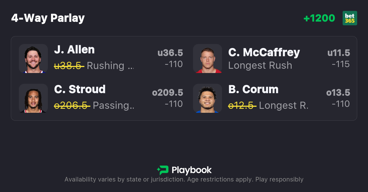 - Christian McCaffrey Longest Rush Under 11.5 Yards (+104 at FanDuel)