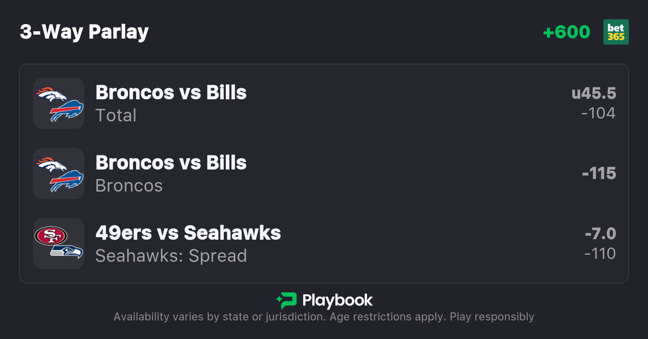 First, we'll target Bills vs. Broncos in the early window, followed by our best bets for 49ers vs. Seahawks later in the evening.