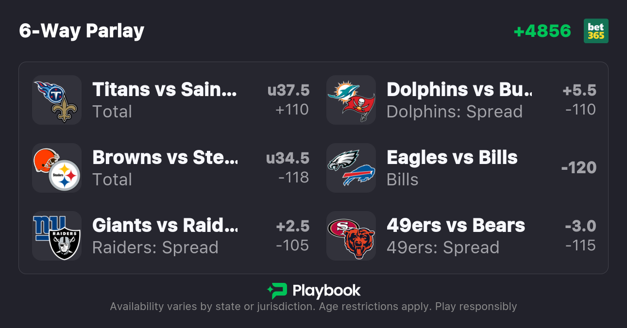 First, we'll target Saints vs. Titans and Steelers vs. Browns in the early window. Later in the afternoon, we have a pair of picks for Eagles vs. Bills and Giants vs. Raiders. We also have picks for Buccaneers vs. Dolphins, Bears vs. 49ers, and more.