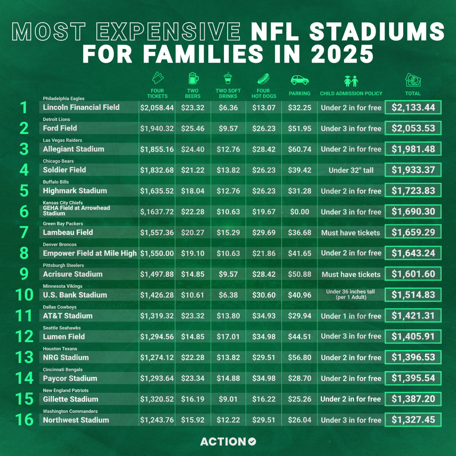 At the top of the list are the Philadelphia Eagles, where taking a family of four to Lincoln Financial Field costs $2,133.44 on average. Tickets alone push the total well past the $2,000 mark at $2,058.44 — the highest in the league — with food, drinks, and parking adding only modestly to the already steep price tag. That’s nearly $800 above the league-wide average of $1,339.00.