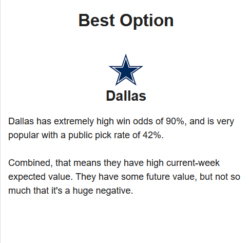 For larger fields, a significant number of people won't have the Cowboys available. In those cases, selecting the Cowboys and hoping for a loss or two from other popular choices is the way to go.