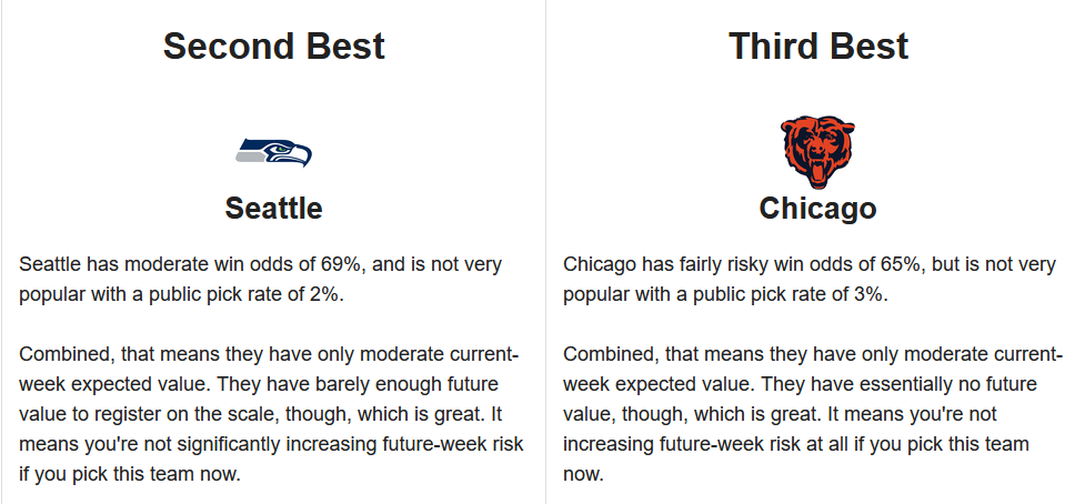 I would only resort to the Bears in small pools if none of the other options are available. However, I'd consider them in larger pools over their more popular counterparts. The combined value of leverage over the field and saving better teams for later is important, especially in pools where the winner(s) likely need to last the entire season.