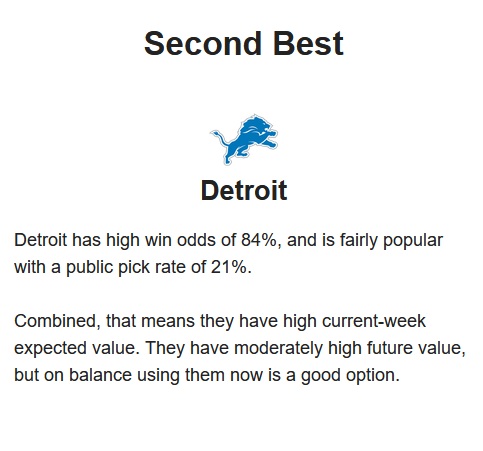 The Rams are a strong enough option this week that they're my top choice in all field sizes, as they offer a solid balance of safety, future value, and leverage. However, players who still have multiple entries alive would be wise to diversify, which is where the Lions come in.