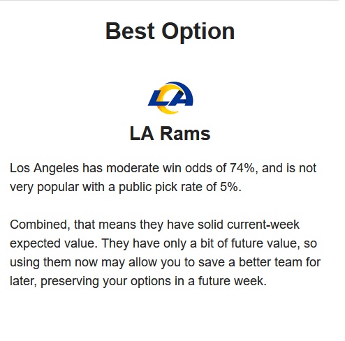 To give a glimpse of how that works, throughout the season, I'll be providing their top option for small (less than 100) and large (1,000+) entry pools. Additionally, they track pick selection data to help identify contrarian options. This is particularly helpful in larger NFL pools, as we're trying to optimize for expected value rather than just the odds of winning.