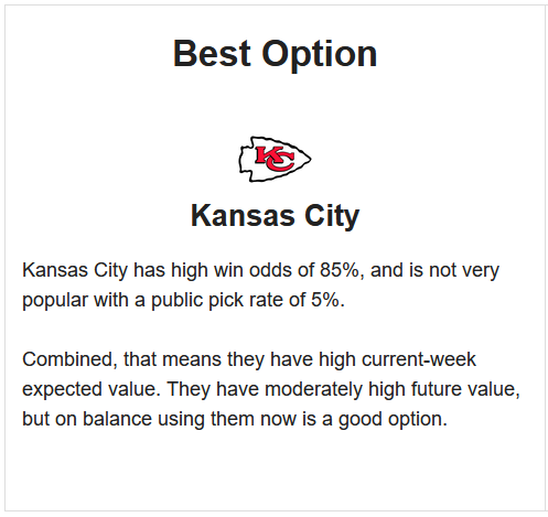 To give a glimpse of how that works, throughout the season, I'll be providing their top option for small (less than 100) and large (1,000+) entry pools. Additionally, they track pick selection data to help identify contrarian options. This is particularly helpful in larger NFL pools, as we're trying to optimize for expected value rather than just the odds of winning.