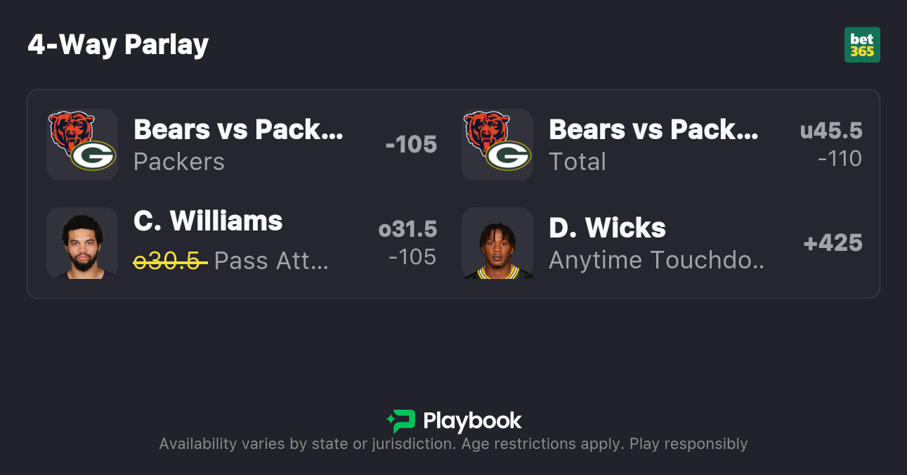 - Packers vs Bears Moneyline: Packers -105, Bears -115