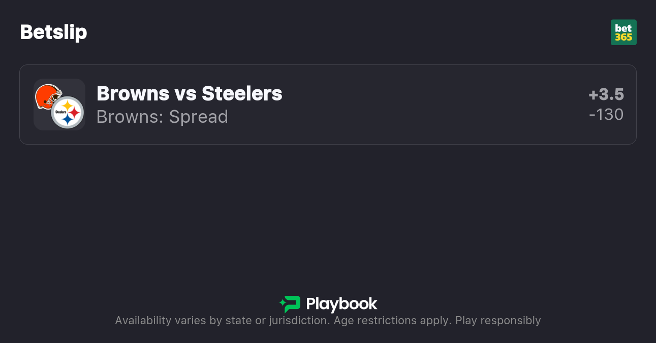 The Steelers are 3-point favorites over the Browns on the spread (Steelers -3), with the over/under set at 33.5. Pittsburgh is a -180 favorite on the moneyline to win outright, while Cleveland is +150 to pull off the upset.