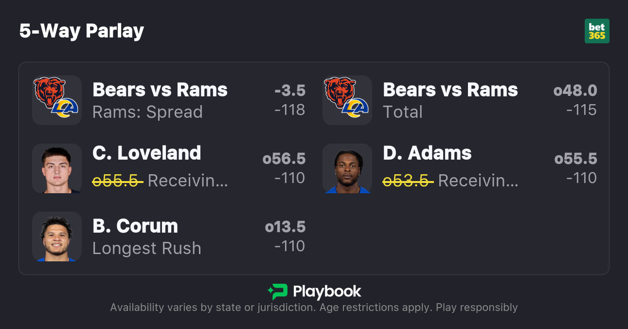 The Rams are 4-point favorites over Bears on the spread (Rams -4), with the over/under set at 48.5 total points. Los Angeles is a -205 favorite to win outright on the moneyline, while Chicago is +170 to pull off the upset.