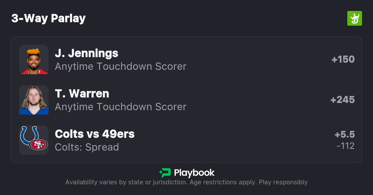 - Jauan Jennings anytime TD +150: Jennings has scored in five of his last six games. He has scored on 12.1% of his targets from Brock Purdy this season compared to 7.3% from Mac Jones. The Colts will be without Ward and Gardner, who combined to not allow a touchdown on 383 snaps in coverage.