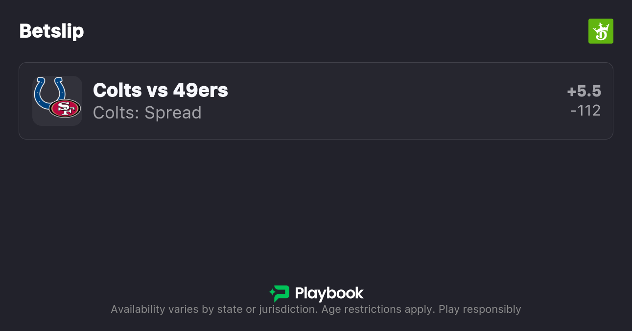 - 49ers vs Colts pick: Colts +5.5 (-112 | Play to +4)
