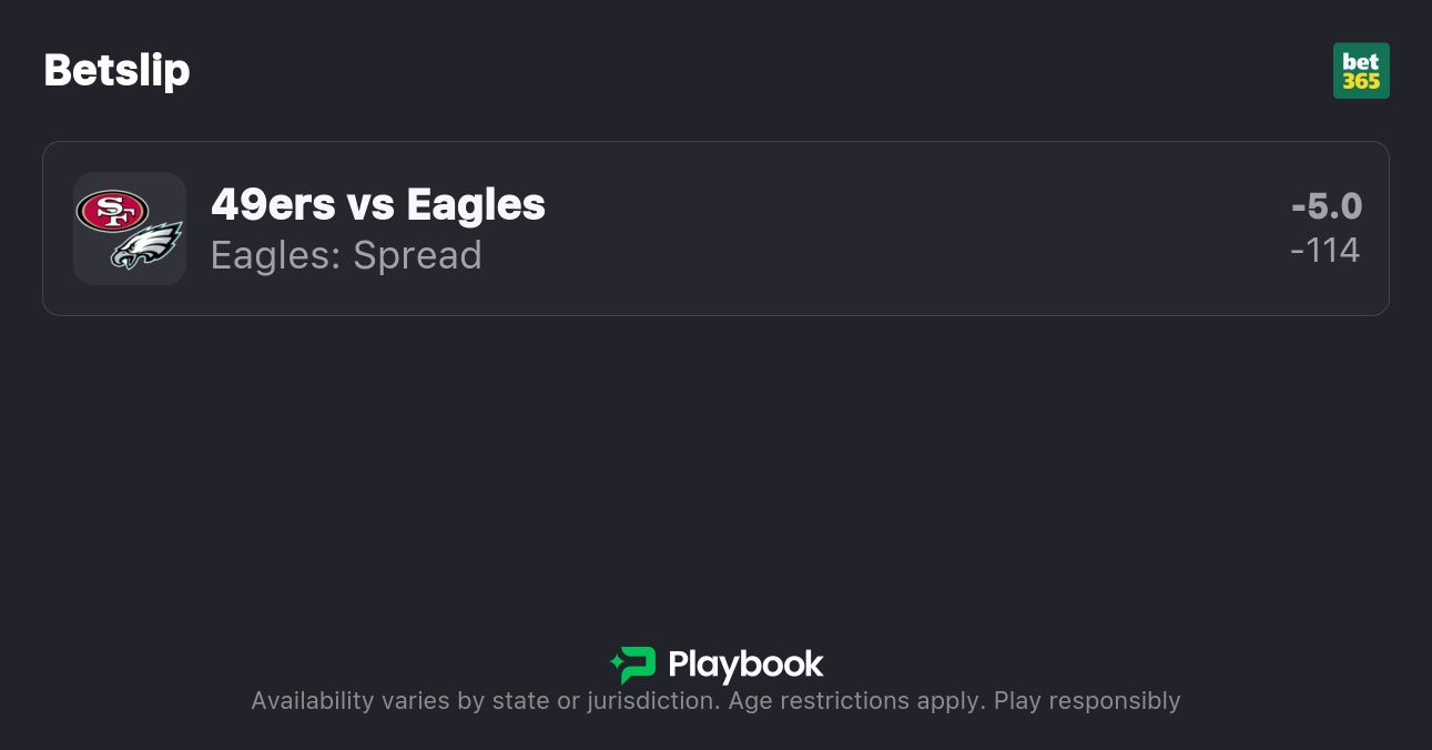 My 49ers vs Eagles best bet is on Philadelphia to cover the spread. Find the best odds by checking our live NFL odds page.