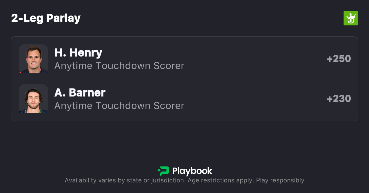 Hunter Henry + AJ Barner Anytime Touchdown Parlay (+1000)