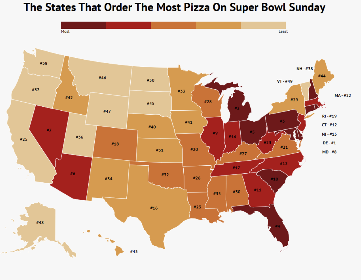 - Delaware orders (and eats) the most pizza on Super Bowl Sundays.