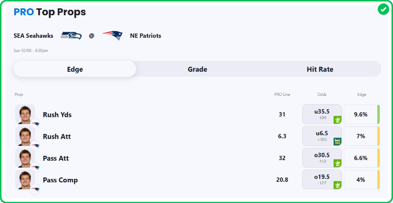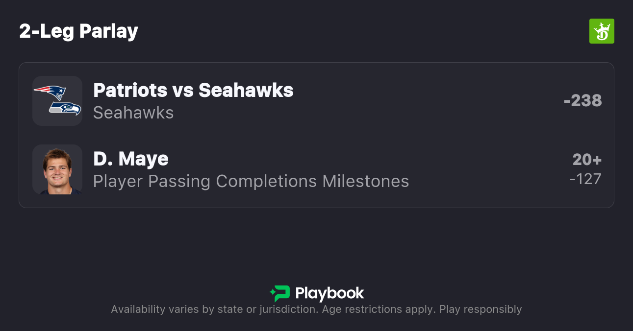- Patriots vs Seahawks Moneyline: Patriots +195, Seahawks -238