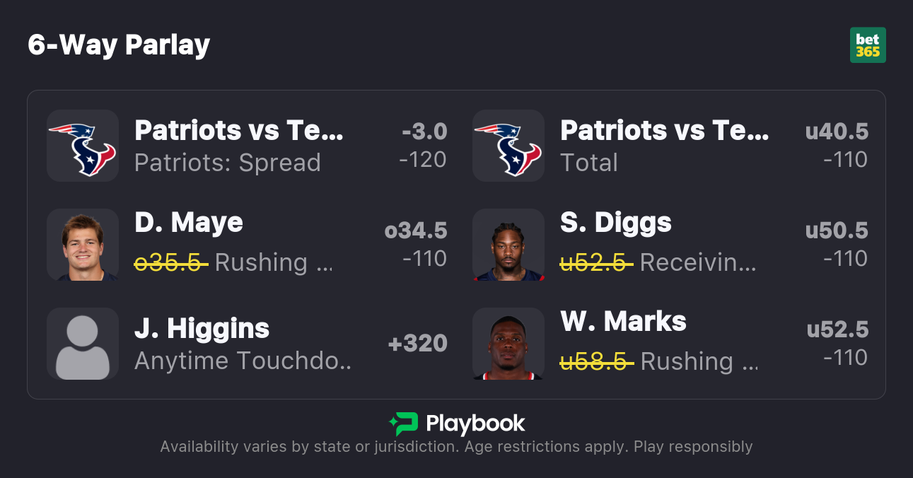The Patriots are 3-point favorites over the Texans on the spread (Patriots -3), with the over/under set at 40.5 total points. New England is a -180 favorite to win outright on the moneyline, while Houston is +150 to pull off the upset.