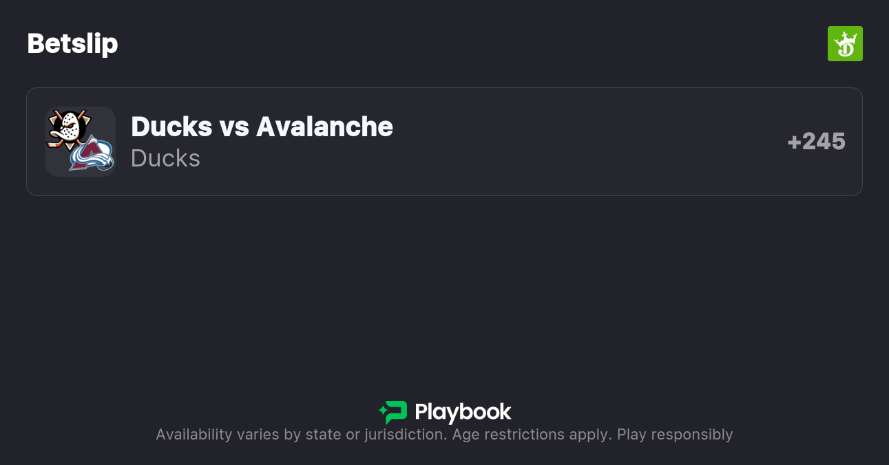 Ducks vs. Avalanche Moneyline: Ducks +240, Avalanche -305