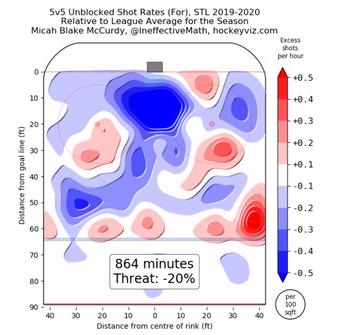 But even St. Louis' power play is due for a bit of regression. The Blues are currently averaging 10 goals per 60 minutes on the man advantage, but they are only generating 5.2 expected goals per hour on the power play. St. Louis' league-best 20.7% shooting percentage on the PP is providing a lifeline for a desperate offense.
