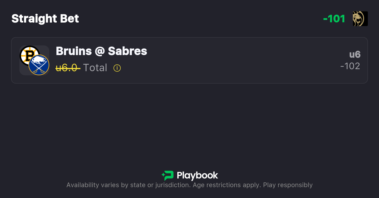 • Bruins vs. Sabres Over/Under: 6 (-118o/-102u)