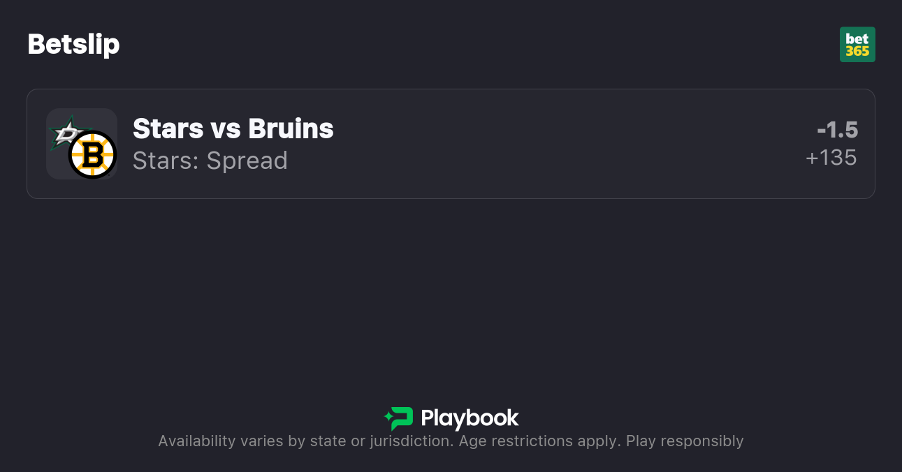 - Bruins vs. Stars Spread: Stars -1.5 (+135 ), Bruins +1.5 (-160)