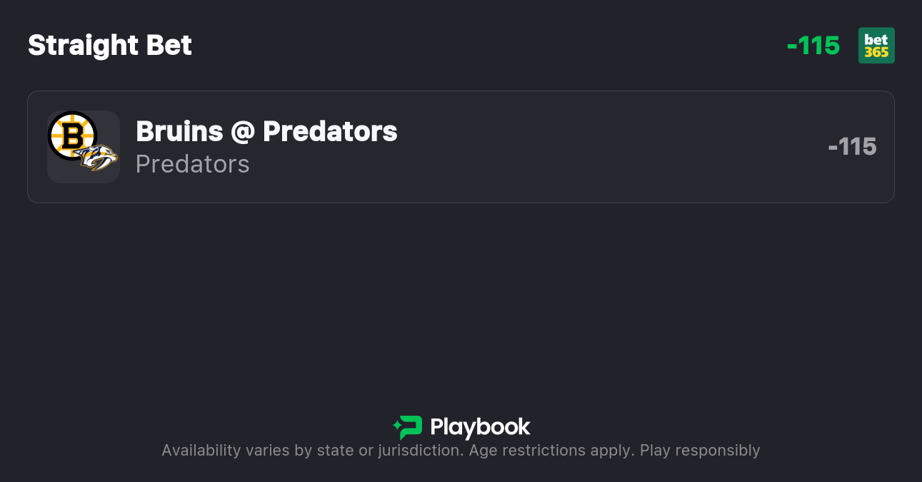 The Predators are favored by -1.5 on the puck line, with the over/under set at 6.5 (-100o / -120u). The Predators are a -115 favorite to win outright, while the Bruins are -105 to pull off the upset.
