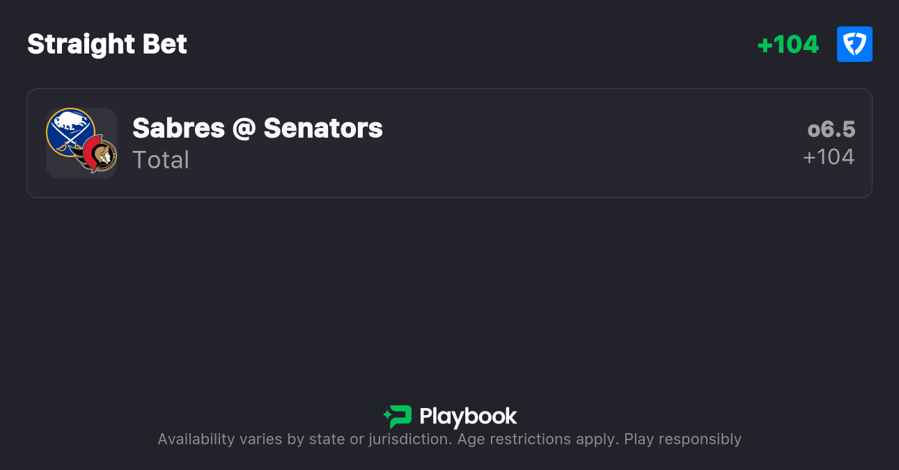 - Sabres vs. Senators Over/Under: 6.5 (-100o / -118u)
