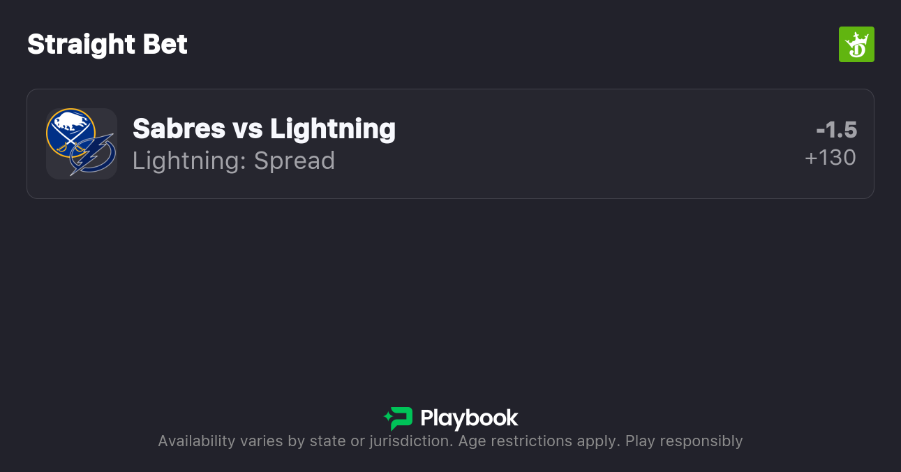 - Sabres vs. Lightning Spread: Lightning -1.5 (+120 ), Sabres +1.5 (-141)