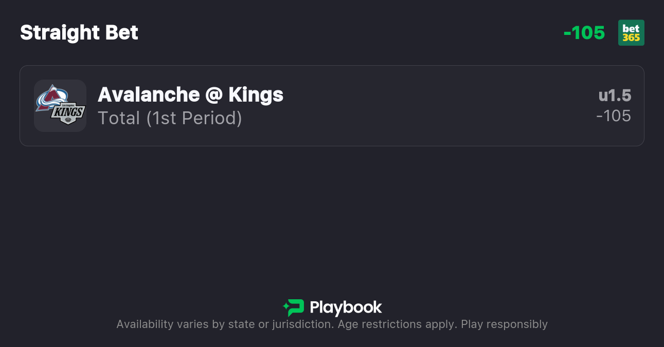 Pick: First Period Under 1.5 -105 (Bet365, Play to -115)