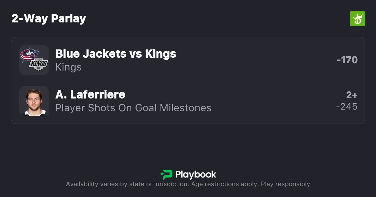 - Blue Jackets vs. Kings Moneyline: Blue Jackets +142, Kings -170