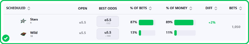 The Stars are favored by -1.5 on the puck line, with the over/under set at 5.5 (-115o / -105u). The Stars are a -122 favorite to win outright, while the Wild are +102 to pull off the upset.