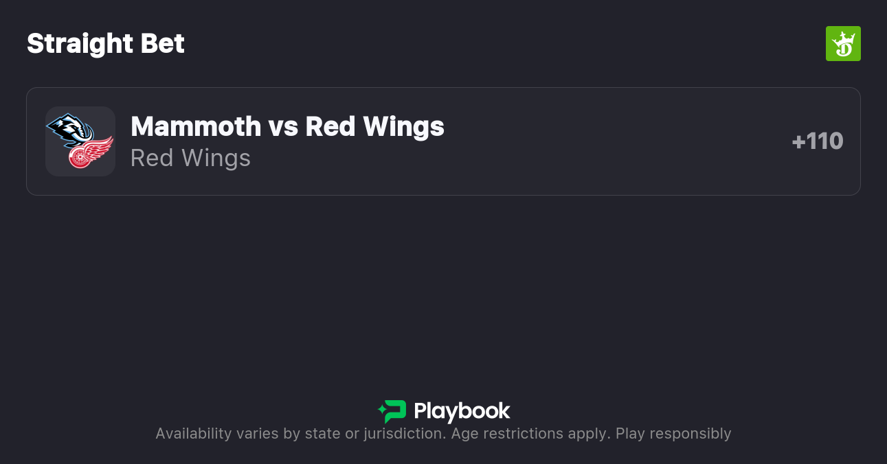 The Mammoth are favored by -1.5 on the puck line, with the over/under set at 6.5 (-106o / -115u). The Mammoth are a -140 favorite to win outright, while the Red Wings are +115 to pull off the upset.