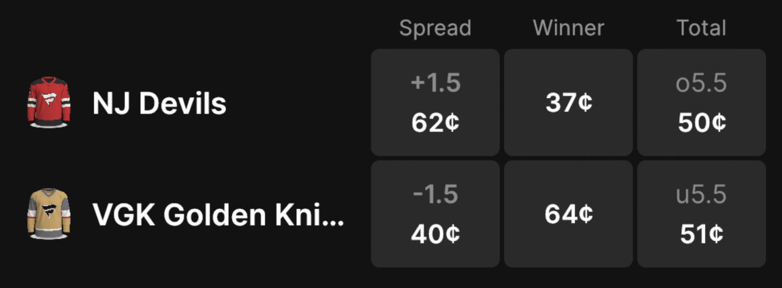 Devils vs. Golden Knights Spread: Golden Knights -1.5 (40 cents), Devils +1.5 (62 cents)