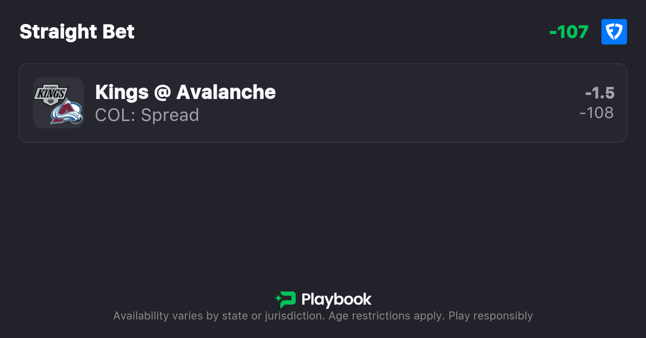 - Kings vs. Avalanche Spread: Avalanche -1.5 (-108), Kings +1.5 (-112)