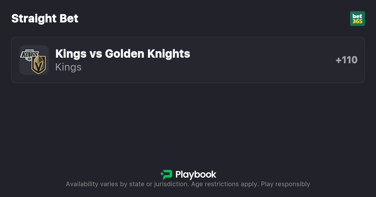 - Kings vs. Golden Knights Moneyline: Kings +110, Golden Knights -130