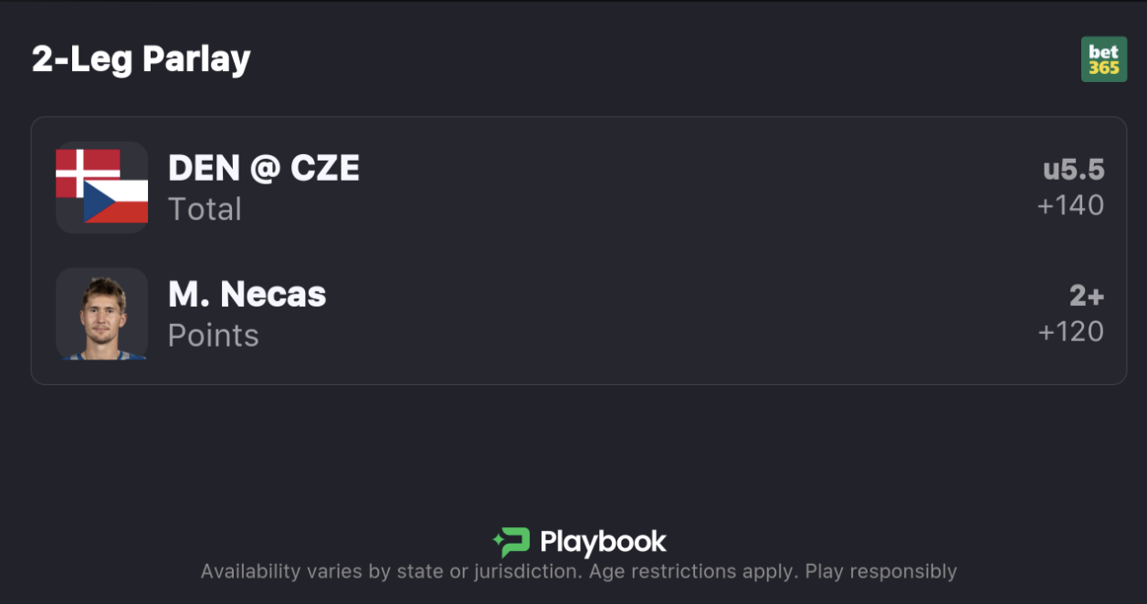 - Czechia vs. Denmark Moneyline: Czechia -325, Denmark +260